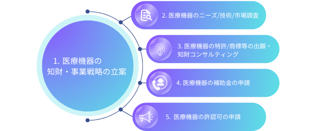 当事務所は、大手の医療機器メーカーで培った医療機器の知見を活かし、知財を用いた市場調査から、特許取得、補助金や許認可の申請、そして経営戦略の立案までを網羅する独自のサービスで、貴社の複雑な課題解決を強力にサポートします。
