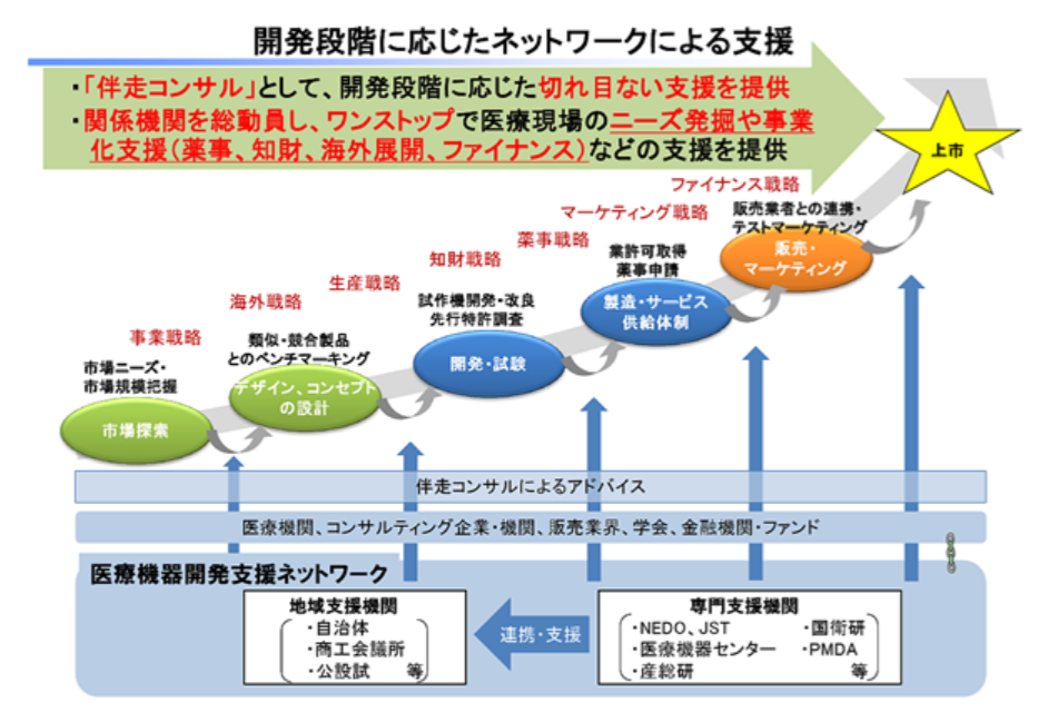 With a view to contributing to future medical device policies, we will promote a national and regional collaborative network that will enable medical device developers, including new entrants, to receive comprehensive support in a wide range of areas, including licensing, intellectual property, technical aspects, and marketing, so that the development and commercialization of medical devices through medical-engineering collaboration can progress autonomously.